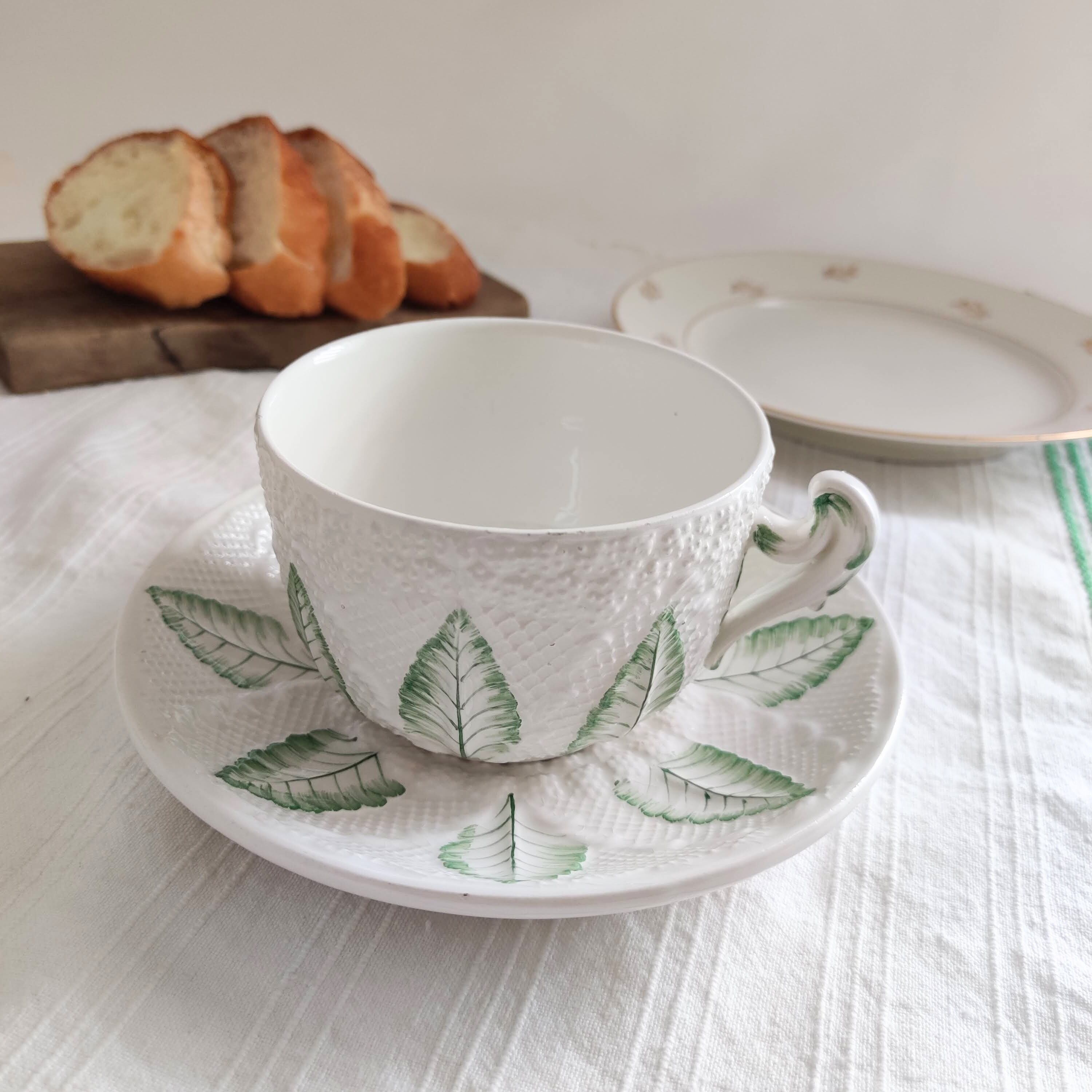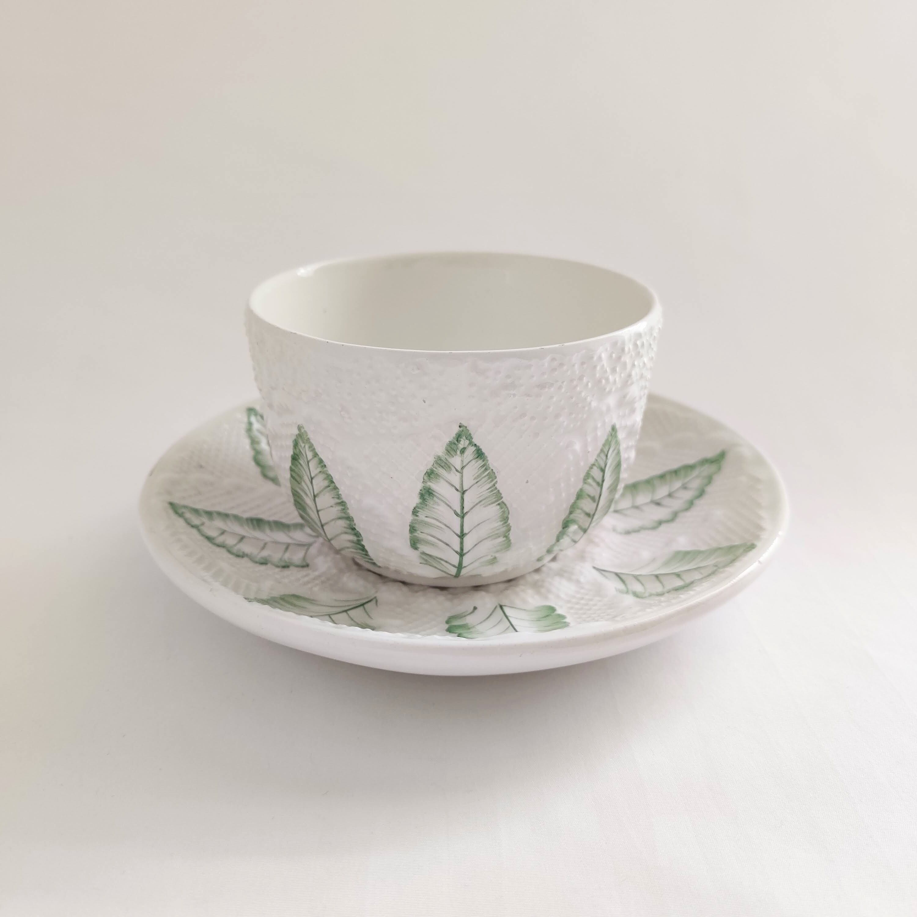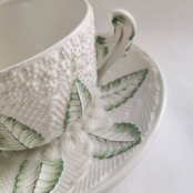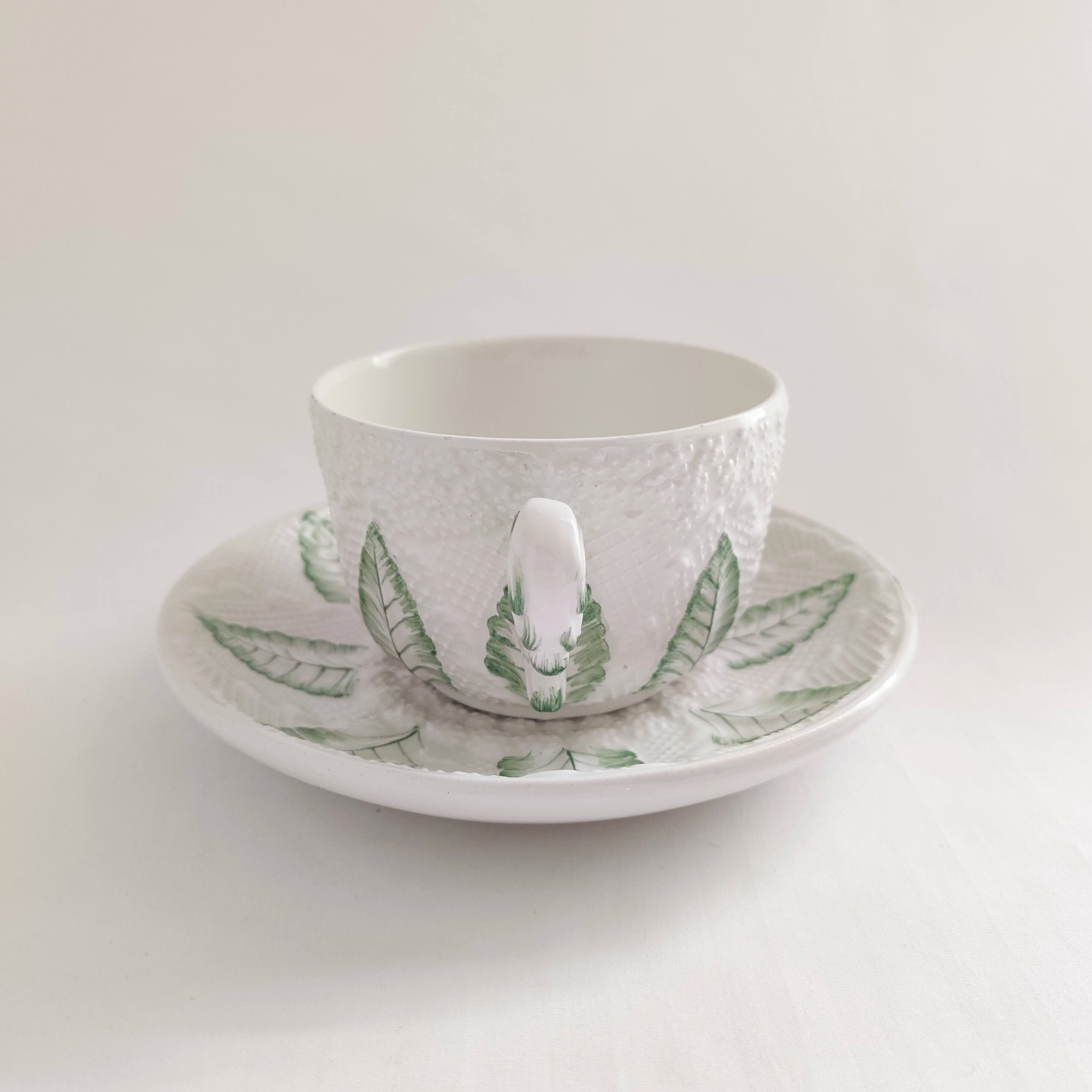 エンボス加工に葉っぱがリズミカルに描かれた、個性的なティーカップとソーサーセット。