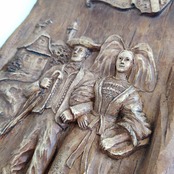 お散歩をするカップルの木彫りレリーフ。