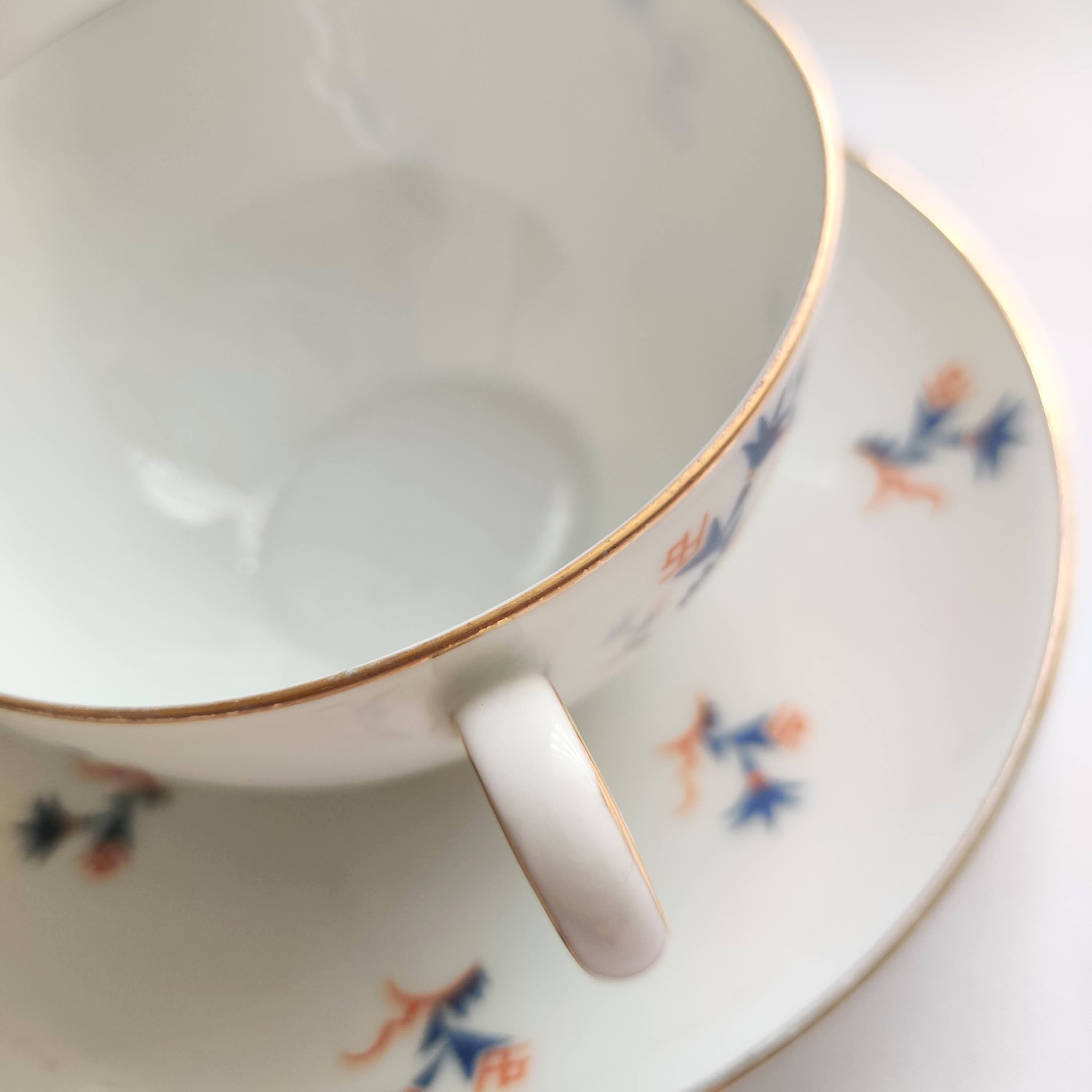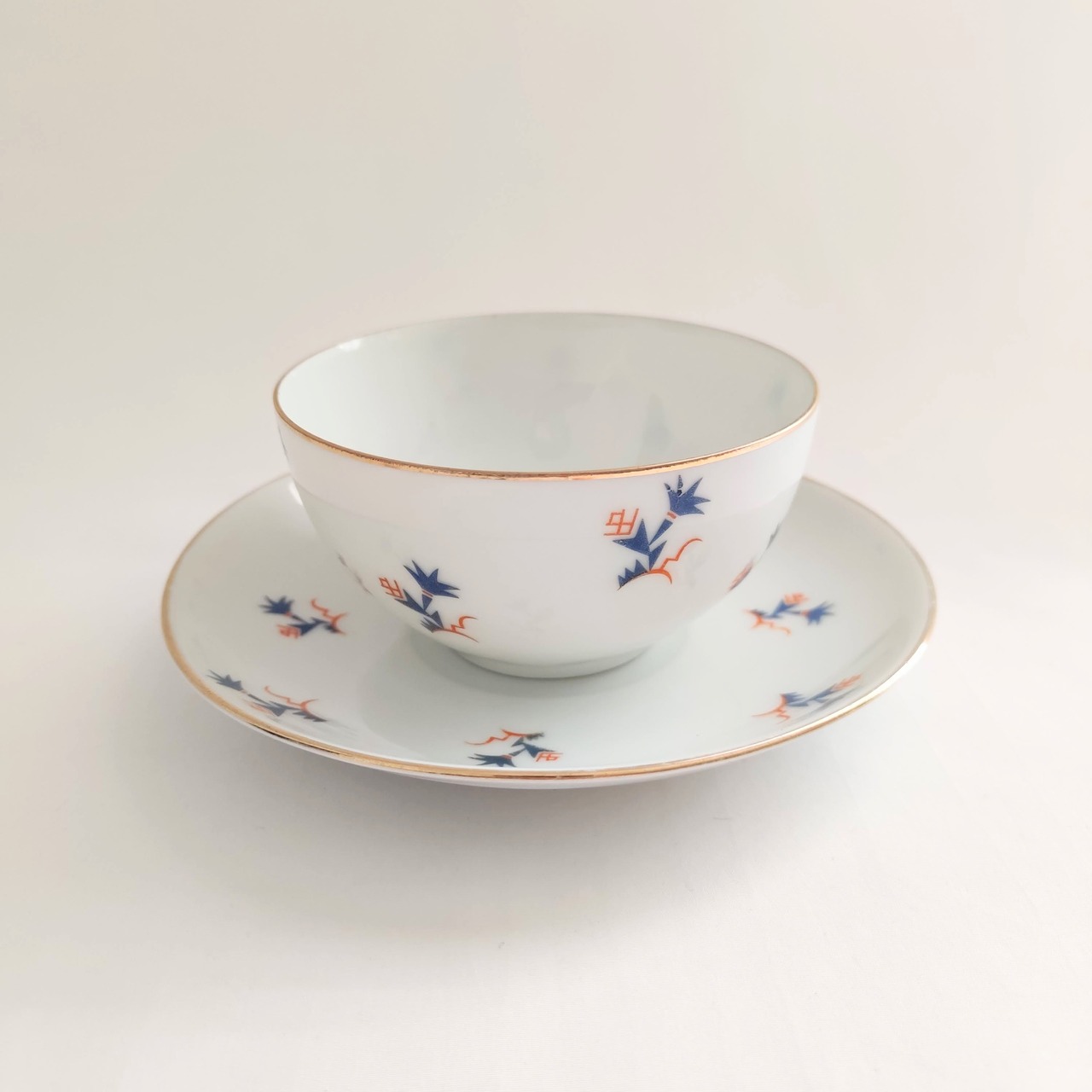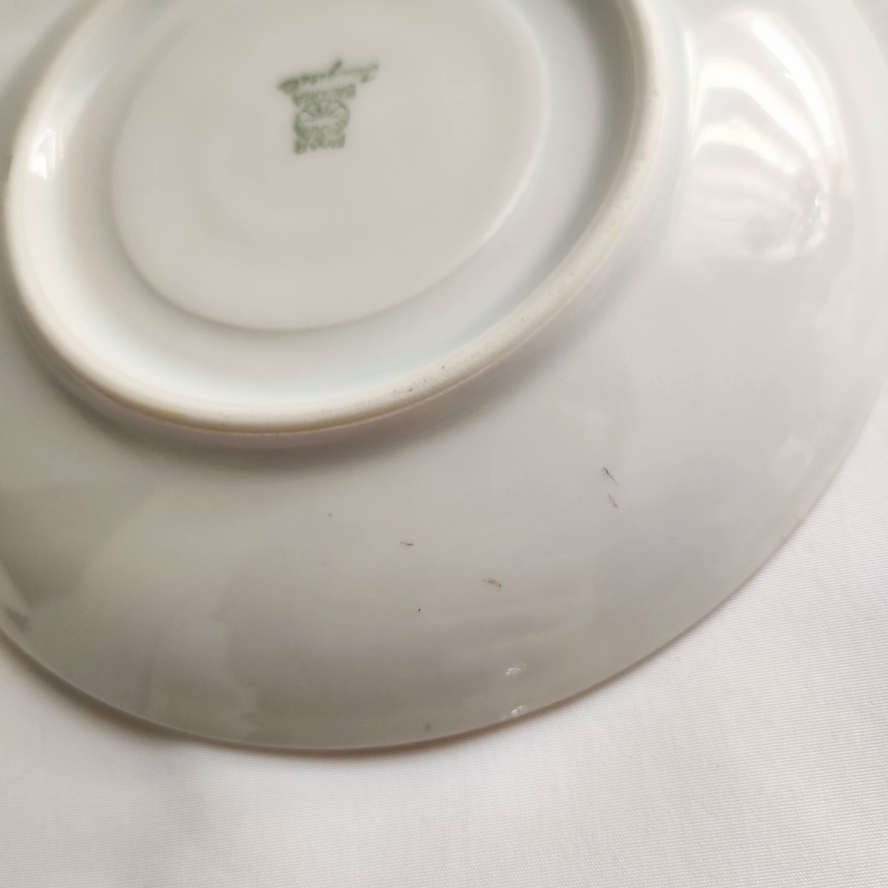 洗浄済みですが、ソーサー表にうっすらと黄色っぽい汚れが付いています。ソーサー裏に製造時に付いた銀色の線の付着がございます。小キズがございます。(写真をご確認下さい)